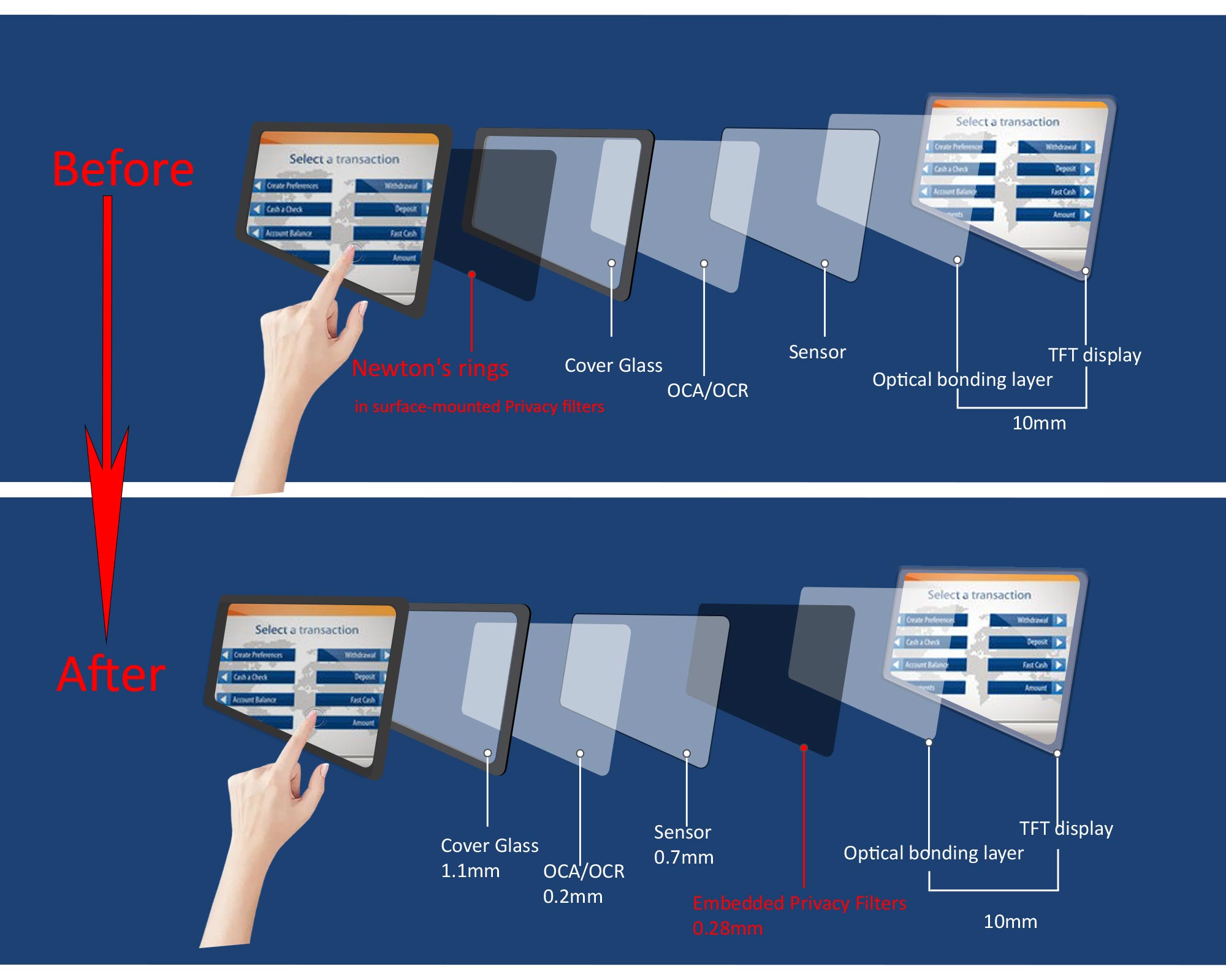 This study systematically addresses integration challenges in industrial touch-privacy displays, focusing on resolving Newton's rings (rainbow patterns) inherent in surface-mounted privacy filters. Through empirical analysis and structural innovation, we developed an embedded integration methodology where privacy filters are laminated within the touchscreen stack. This solution enabled a market-competitive display for ATM applications. Field validation confirmed: